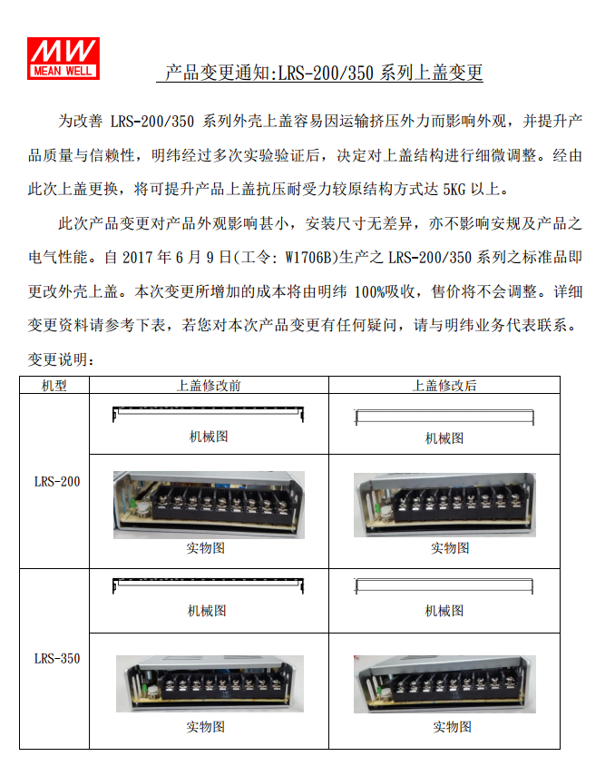 产品变更通知:LRS-200/350 系列上盖变更